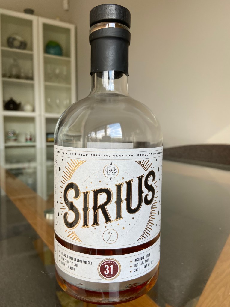 North Star Spirits are quickly becoming one of my favourite independent bottlers. From naming blends after stars to identifying undisclosed distilleries via co-ordinates on the labels, they certainly do things their own way. This release follows hot on the heels of the Vega series – a set of sherried Speyside blended malts that ranged from 22 to 41 years old. Sirius is a blend of Highland malts and is matured in first-fill bourbon casks. It’s bottled at cask strength, and when I saw it’s 43.1%, I wondered whether some casks had dropped below the 40% minimum and then vatted together with casks from other distilleries to bring it back up (as the owner of North Star confirmed was the case with one of their old Bunnahabhains). Ralfy and other reviewers have also touched upon this. I’ve seen rumours that Clynelish is one of the main components here, and the label certainly hints at Clynelish when it mentions waxiness. It also mentions citrus flavours, which, to me, means Balblair above all – so let’s see what it’s like.