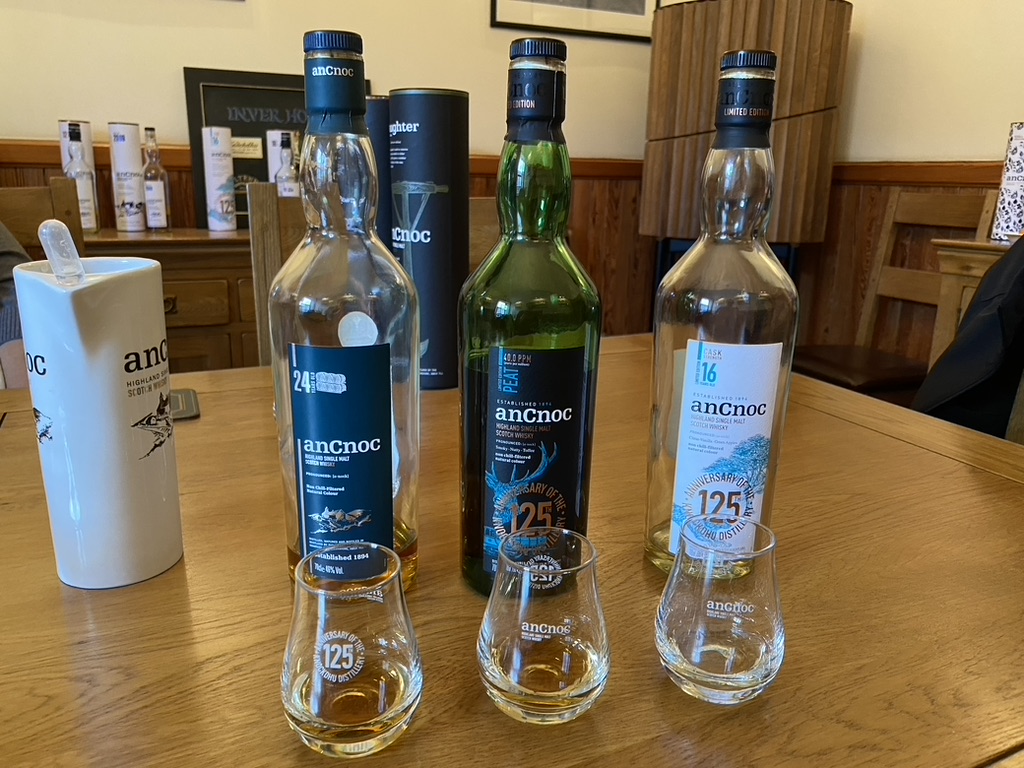 The drams afterwards were pretty special – Gordon asked if I wanted to revisit anything from the online tasting and I was more than happy to try the amazing 24-year-old again. Next to it, I tried two bottles from the distillery’s 125th anniversary – anCnoc Peat and the 16-year-old Cask Strength. Gordon said that they use mainland peat, which explains its sweeter character and the lack of the medicinal and antiseptic notes that you get in Islay malts or Ledaig. As was the case with the anCnoc Peatheart at the online tasting, I was impressed by how rounded and fruity this was behind the smoke. The 16 year-old was a fully Bourbon-matured expression – quite sweet and floral, but also with fresh citrus and apple notes, it ran the 24 close for my favourite of the official bottlings I’ve tried. I will also note that Gordon just offered me the bottles to pour for myself – a far cry from the stingy pours you can sometimes get in other distilleries (in group tastings it’s often luck of the draw, with some glasses a lot fuller than others).